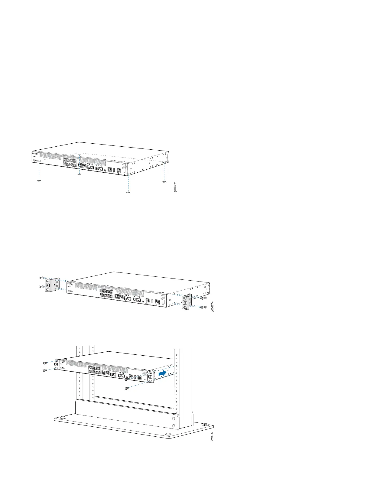 2. Depending on how you want the MX150 to sit in the rack, secure the mounting brackets to the front, center, or rear