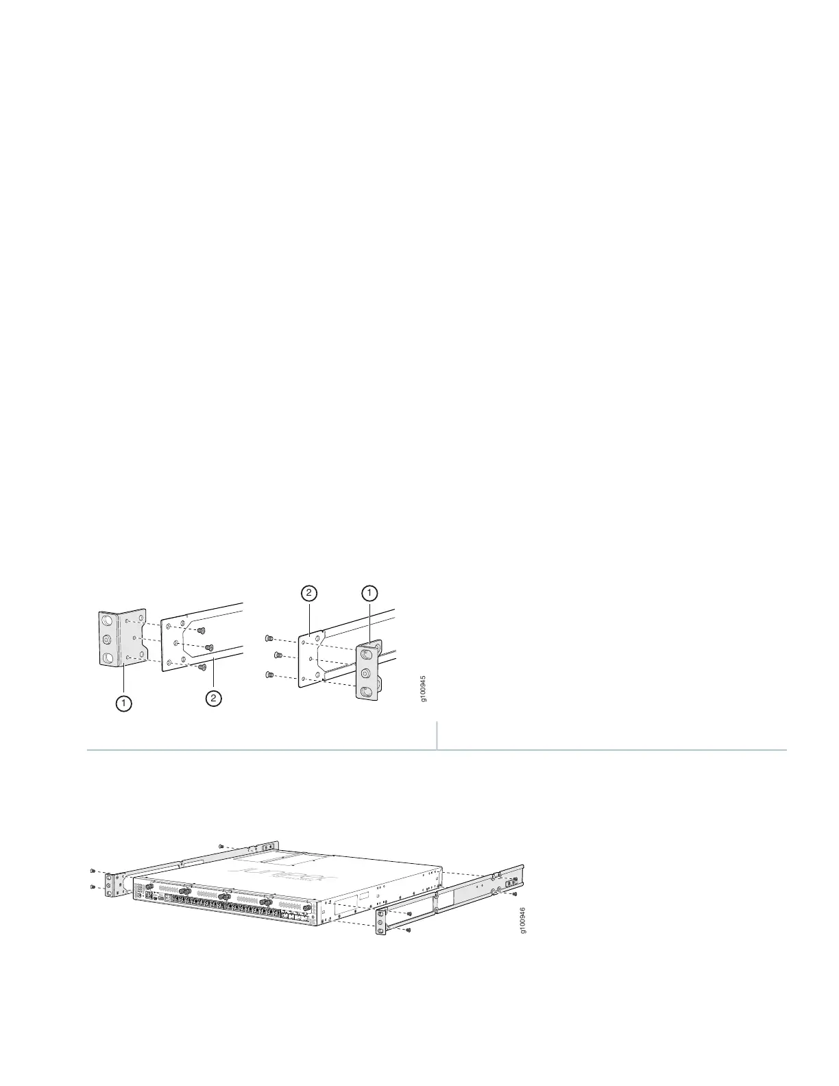 5. Lift the SRX380 and position it in the rack. Line up the bottom hole in each mounting bracket with a hole in each rack