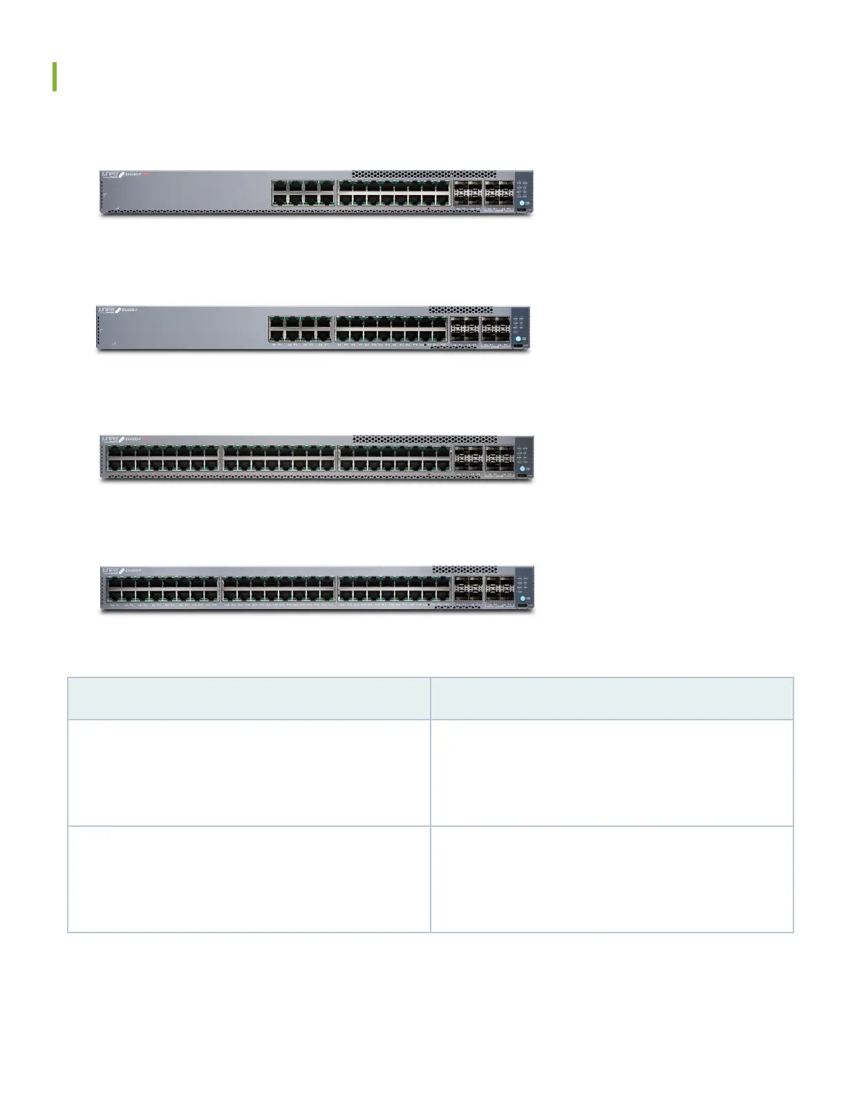EX4100-F-24P and EX4100-F-24T Twenty four 10/100/1000-Mbps RJ-45 ports, four 1/10 Gbps