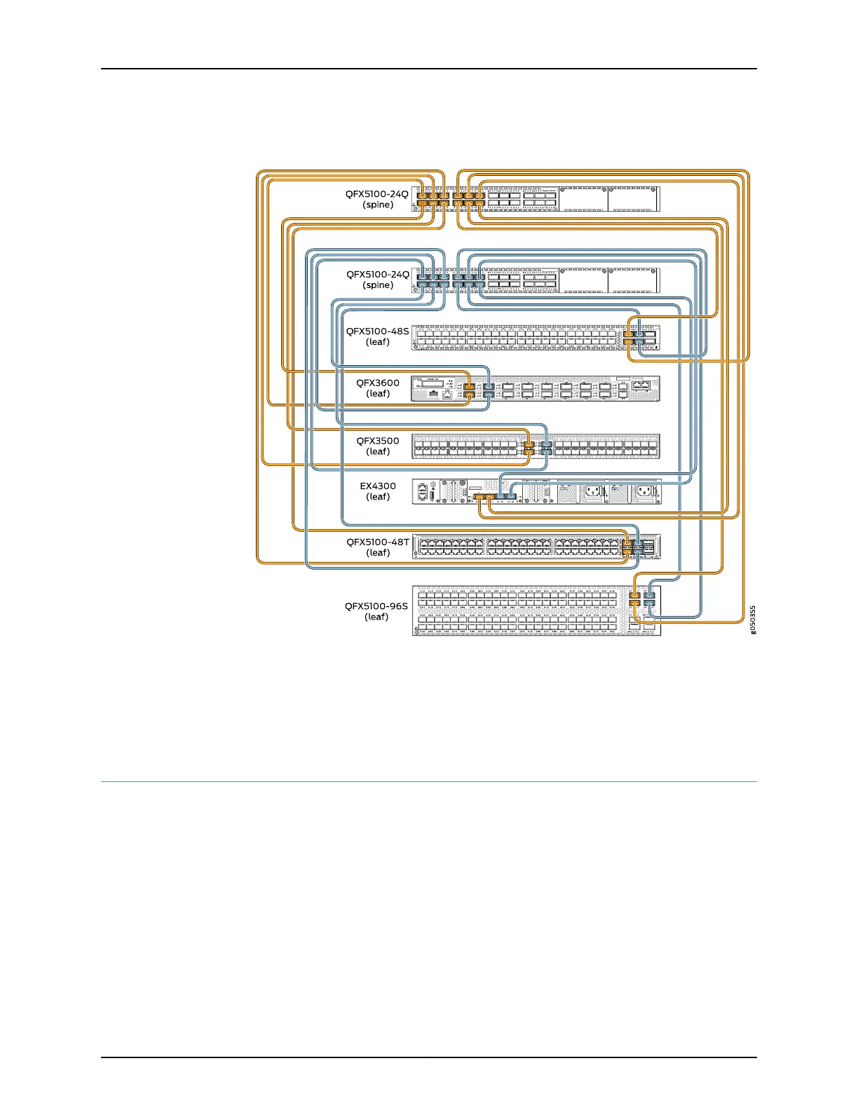 is cabled in a spine and leaf topology, the QFX Virtual Chassis is cabled in a ring topology.