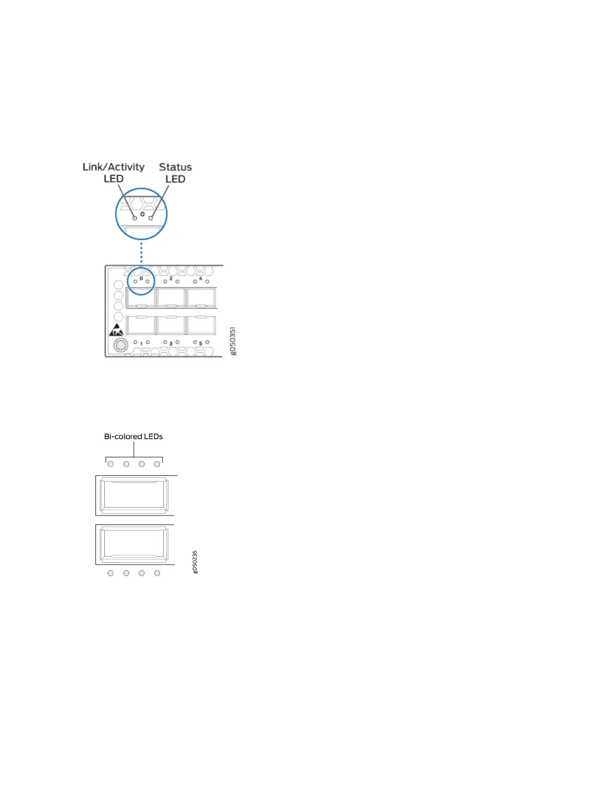 Figure 6 on page 11 shows the locaon of the LEDs on the QSFP+ uplink ports on the EX4600.
