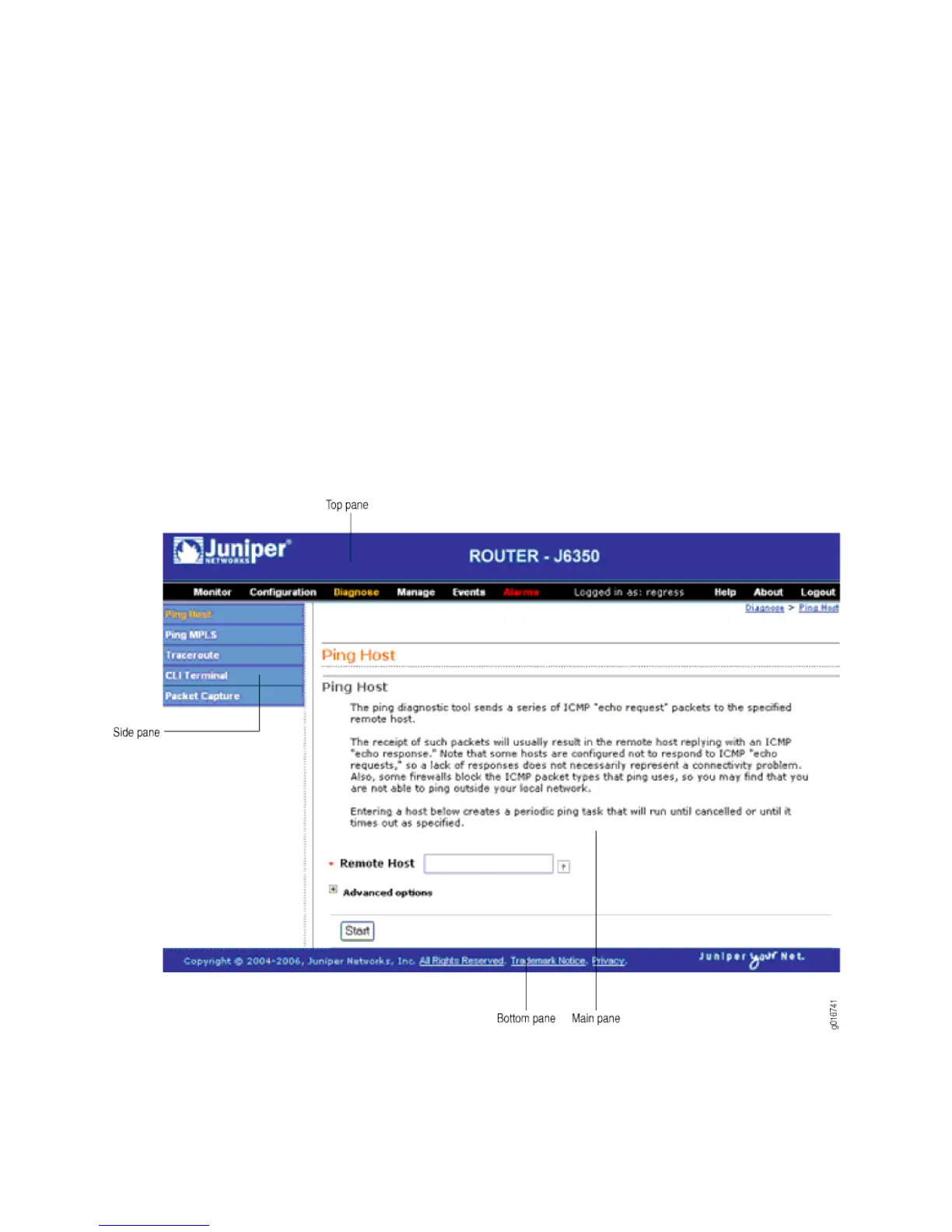 Each page of the J-Web interface is divided into the following panes, as shown in