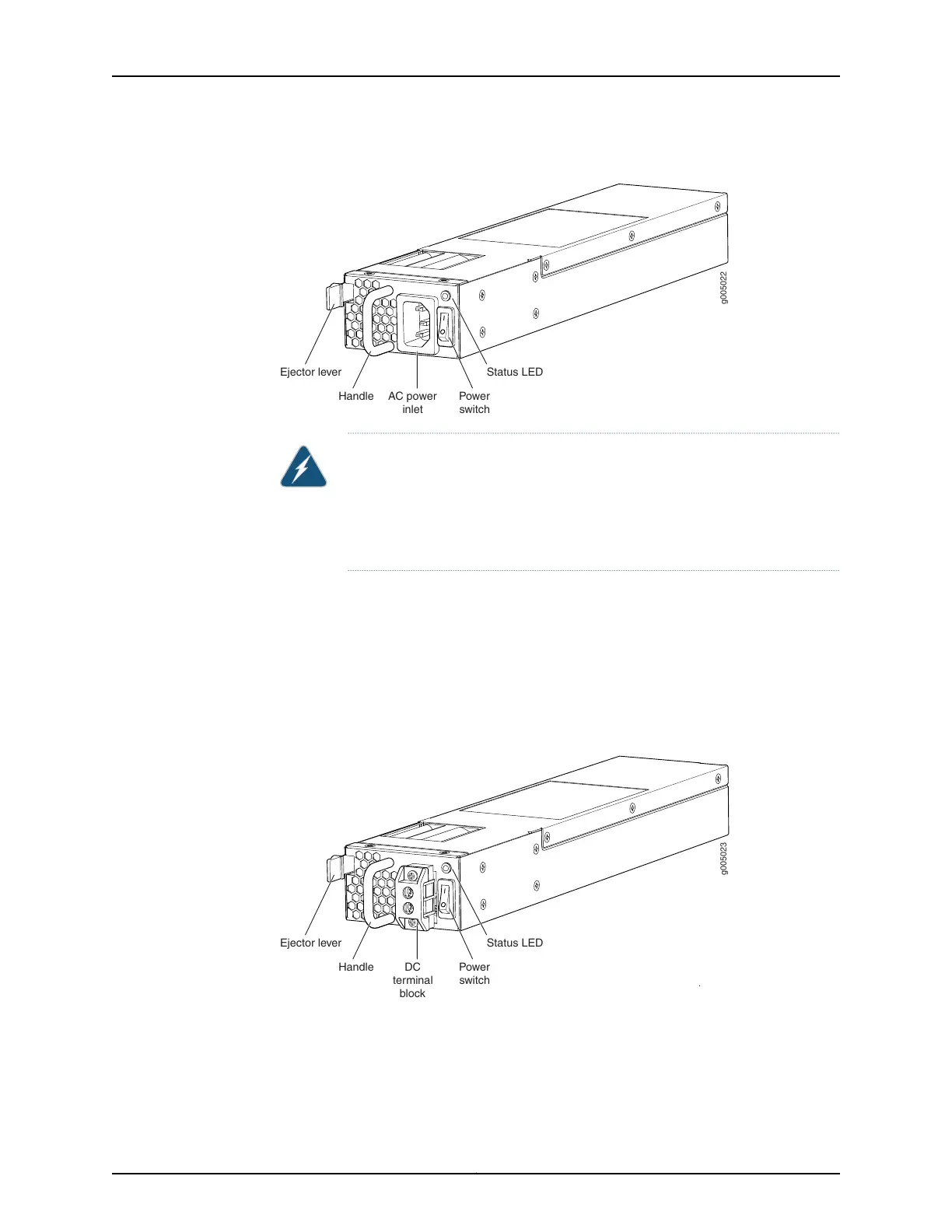 Each DC power supply has a handle, an ejection lever, a power switch, a status LED, and