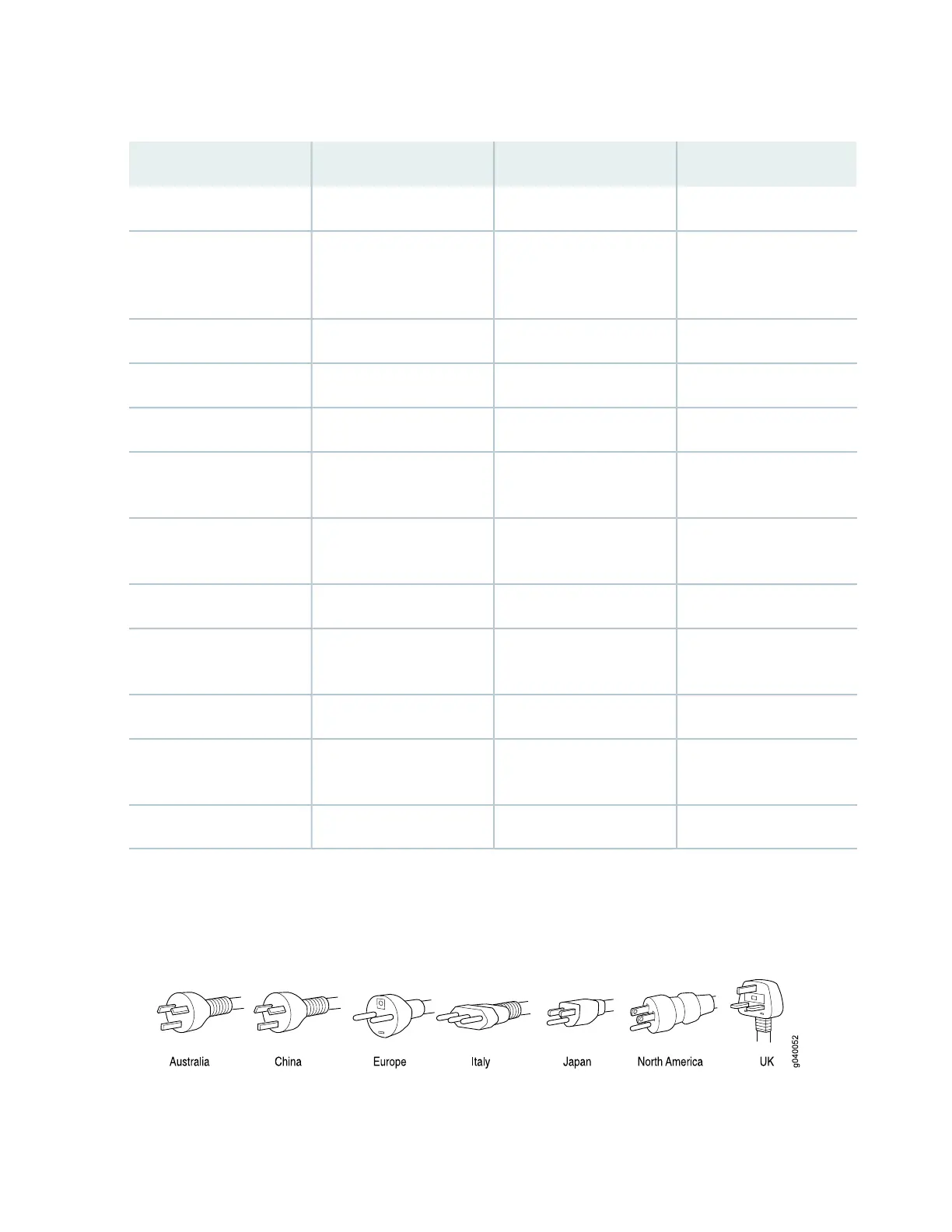 Juniper Model NumberPlug StandardsElectrical SpecificationsCountry/Region