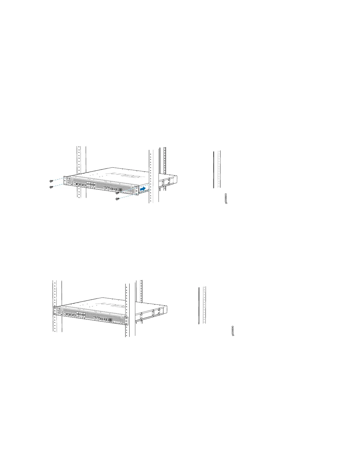 7. Install mounting screws into each of the open front-mounting holes aligned with the rack, starting from