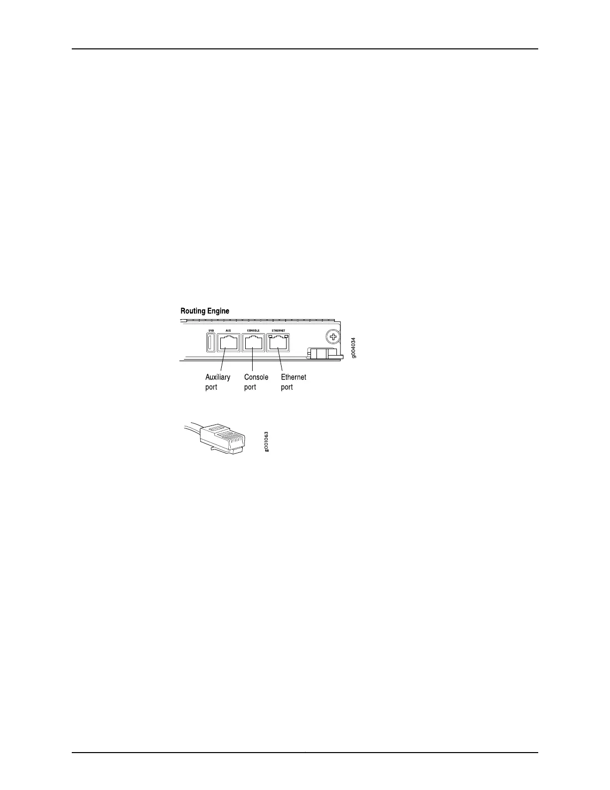 auxiliary device, connect it to the AUX port on the Routing Engine. Both ports accept a