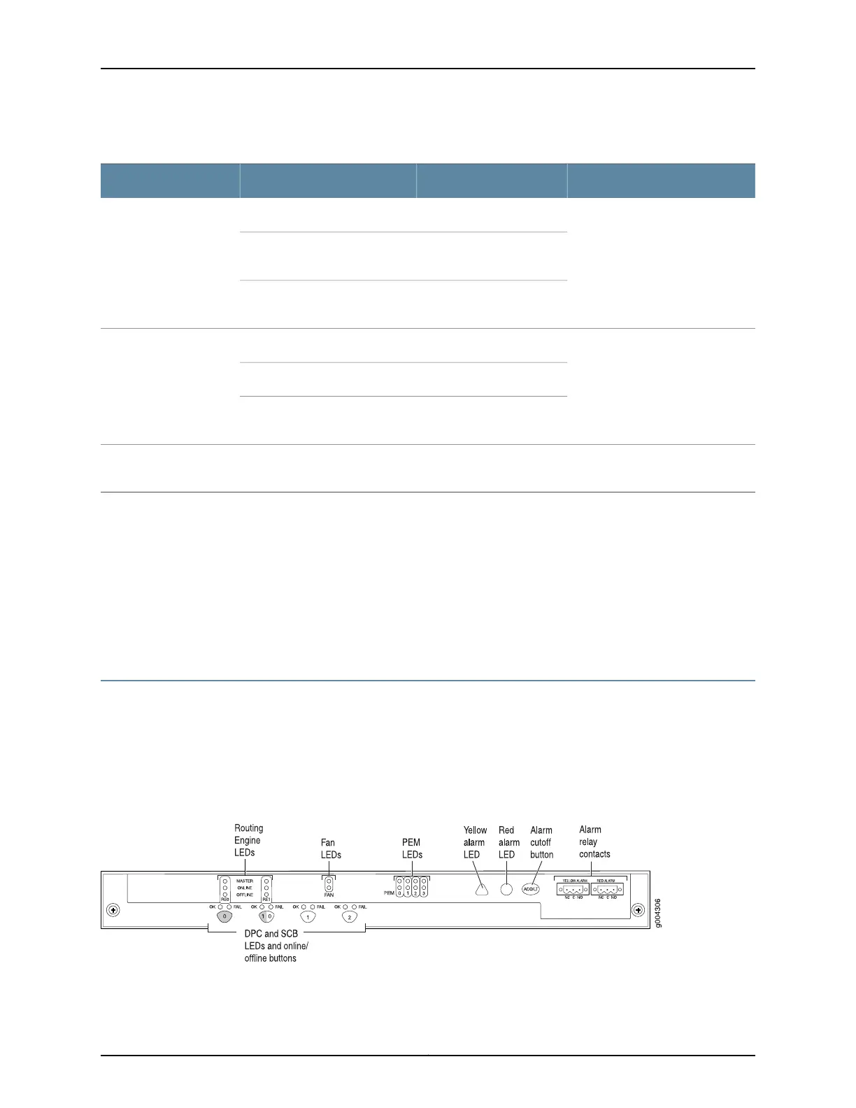 LEDs for the router components, the alarm relay contacts, and alarm cutoff button. See