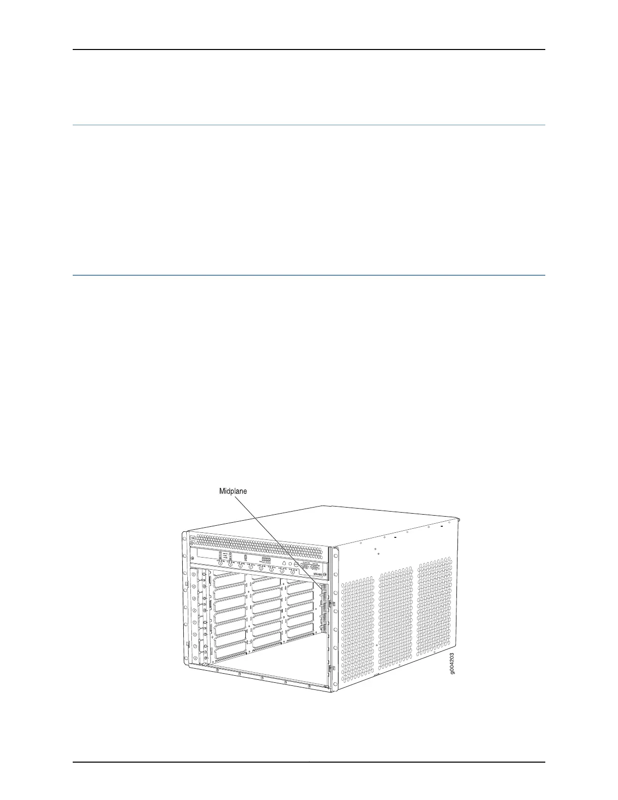 cage (see Figure 11 on page 26). The line cards and SCBs install into the midplane from