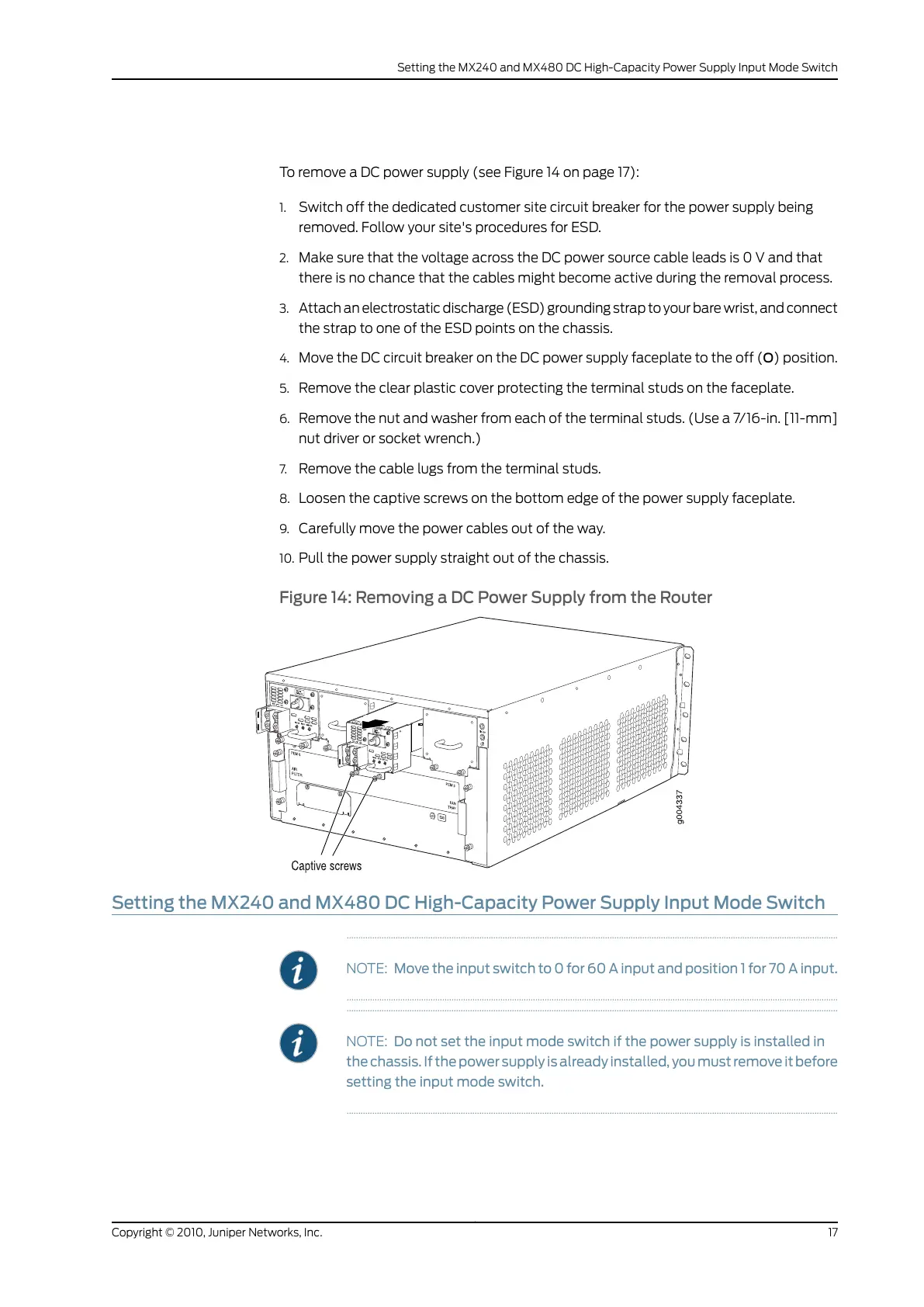 Setting the MX240 and MX480 DC High-Capacity Power Supply Input Mode Switch
