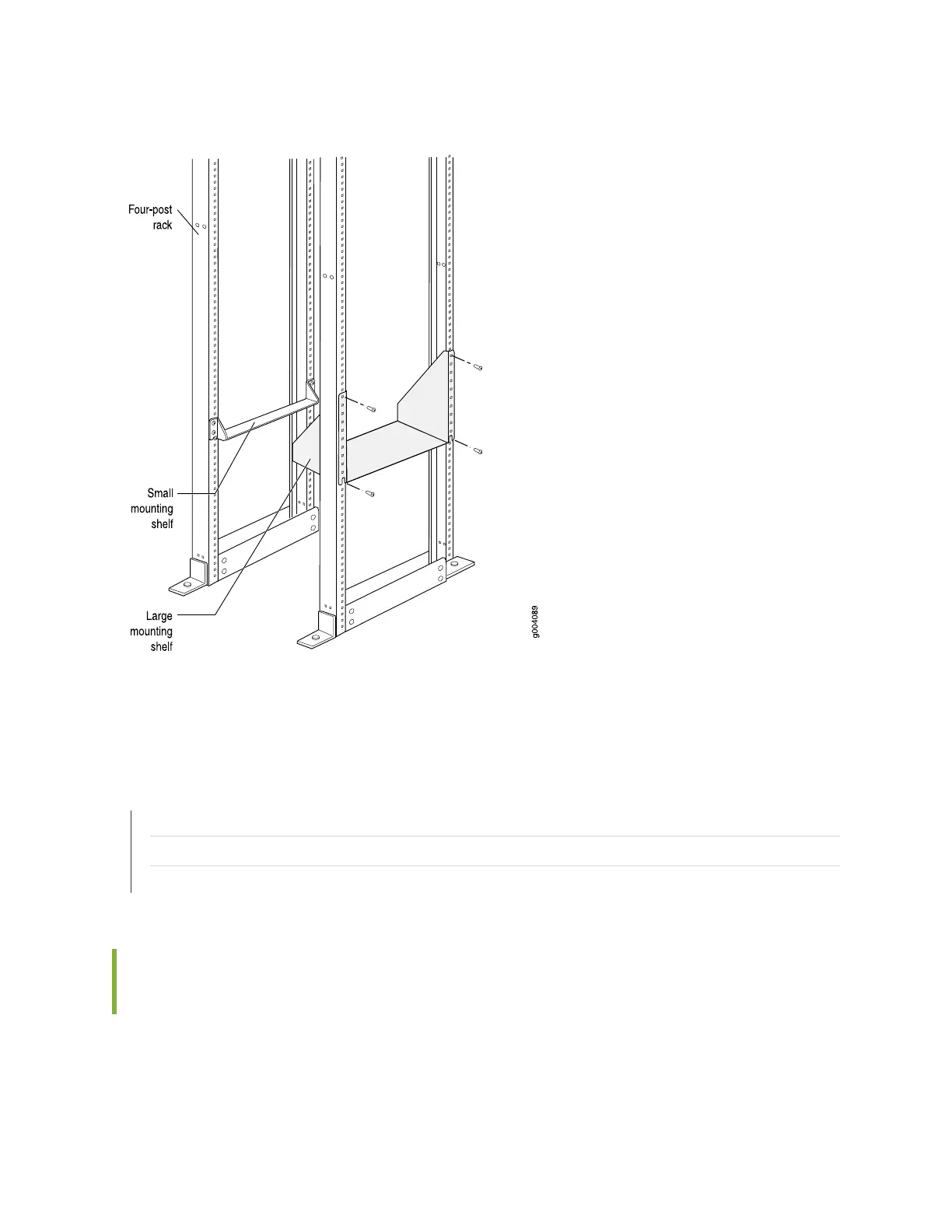 Before front-mounting the router in an open-frame rack, install the large mounting shelf on the rack, and