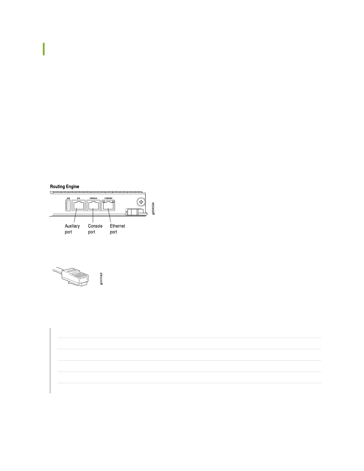RJ-45 connectors to the ETHERNET port on the Routing Engine. One Ethernet cable is provided with the