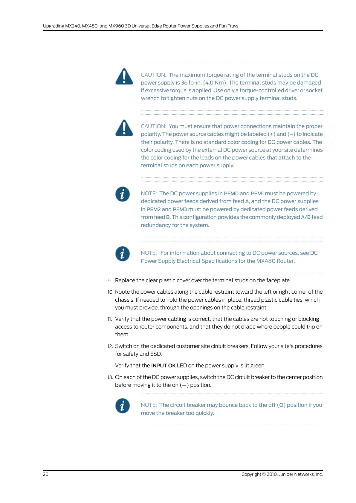 11. Verify that the power cabling is correct, that the cables are not touching or blocking