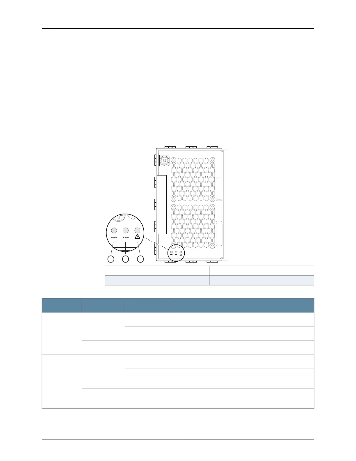 Table 21 on page 43 describes the power supply module LEDs on the faceplate.