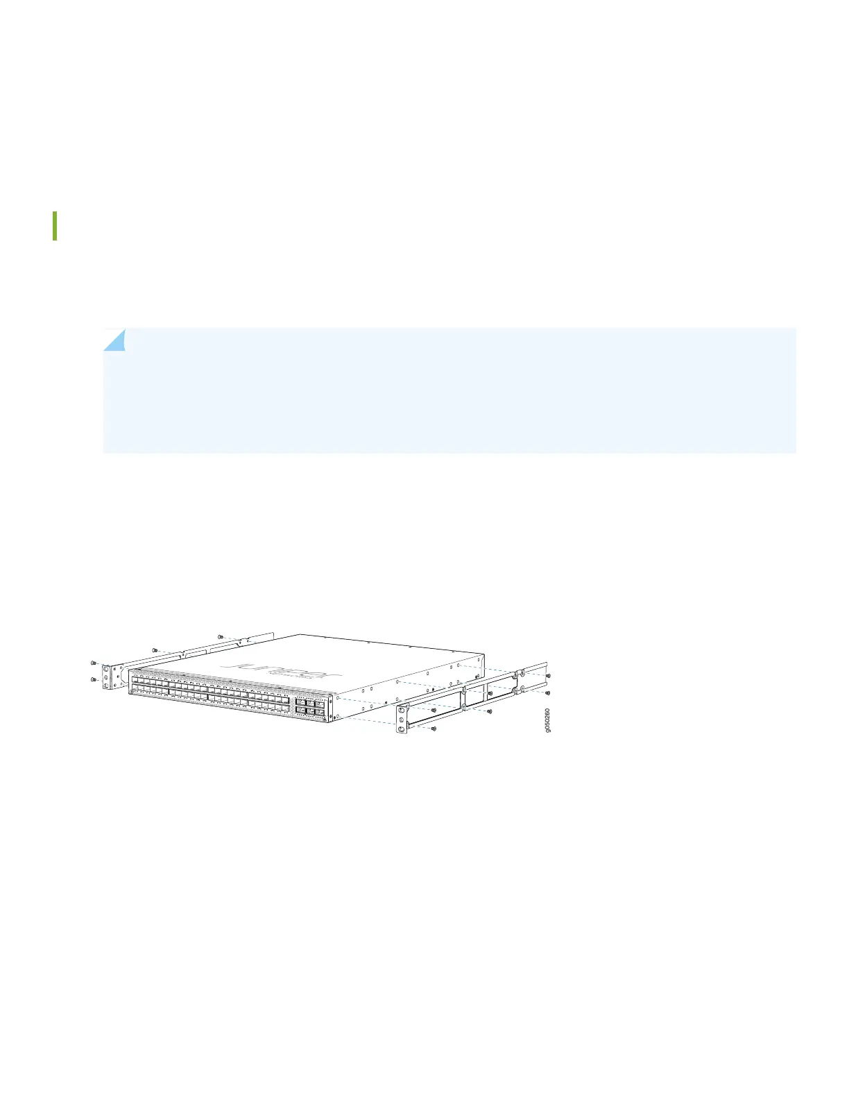 8. Have a second person secure the front of the switch to the rack using four mounting screws (and cage nuts and washers