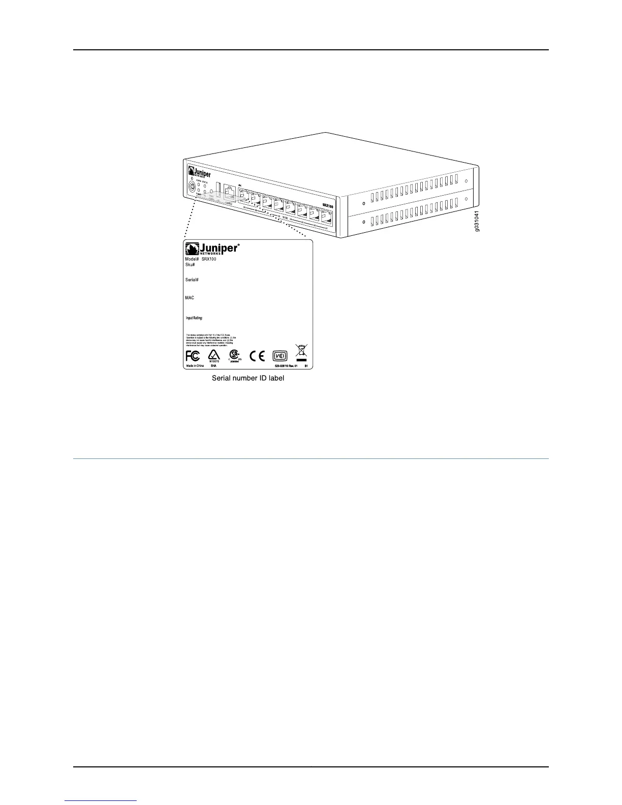 Figure 17: Location of SRX100 Services Gateway Serial Number and Agency
