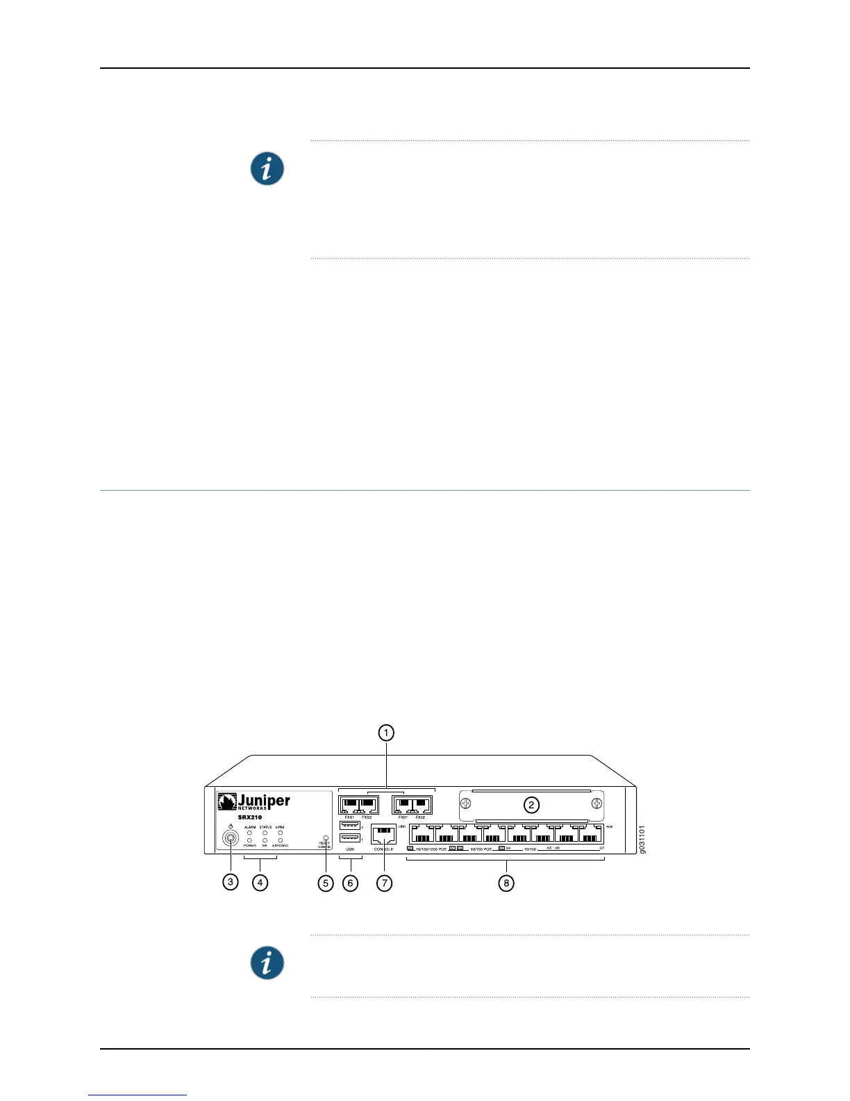 SRX210 Services Gateway with Integrated Convergence Services Front Panel on page 12