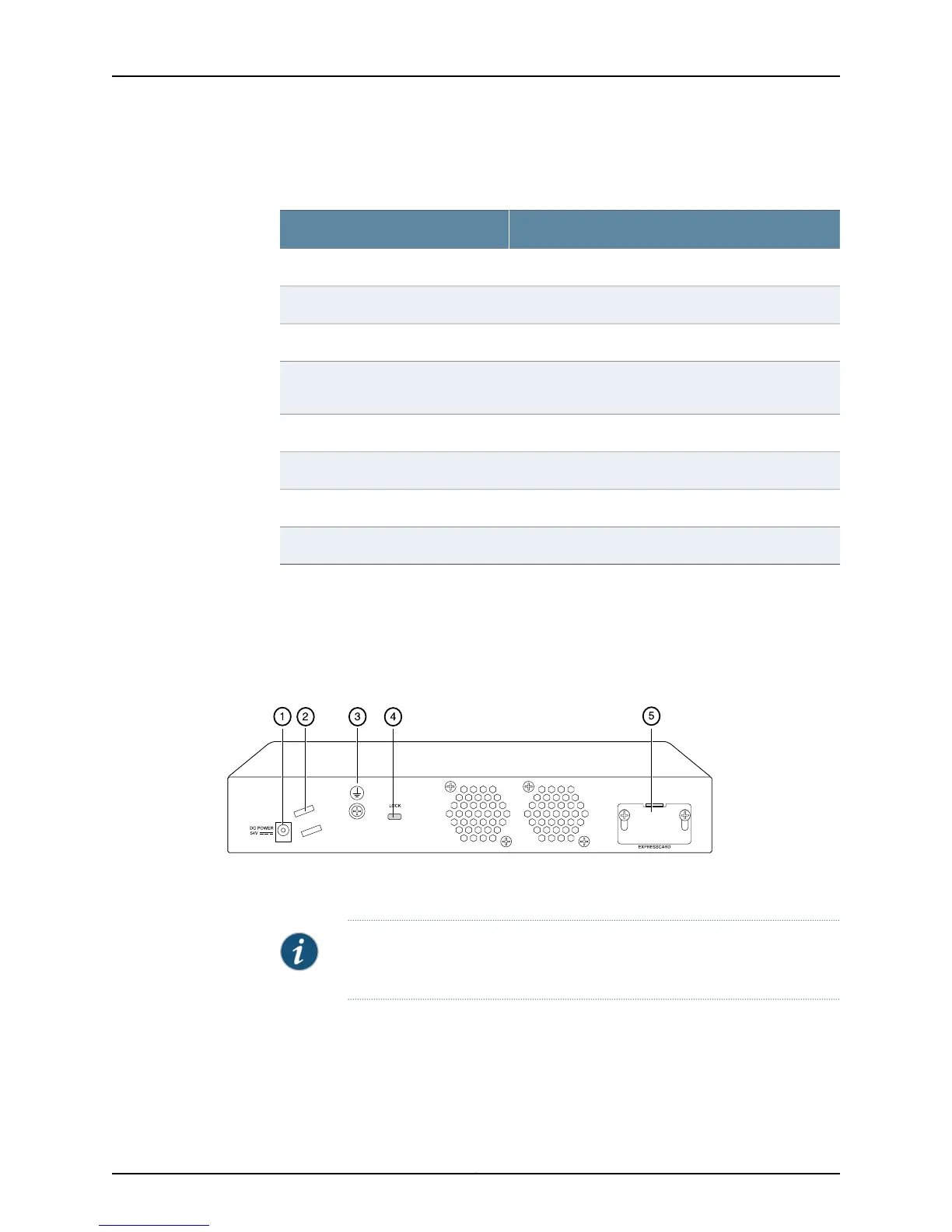 Figure 6 on page 13 illustrates the back panel of the SRX210 Services Gateway with