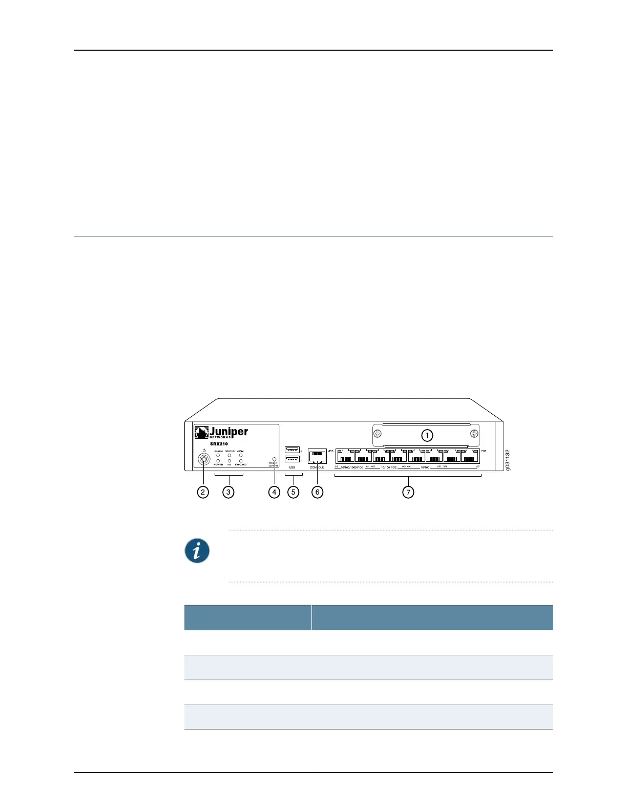 This topic contains views of the front panel and back panel of the SRX210 Services