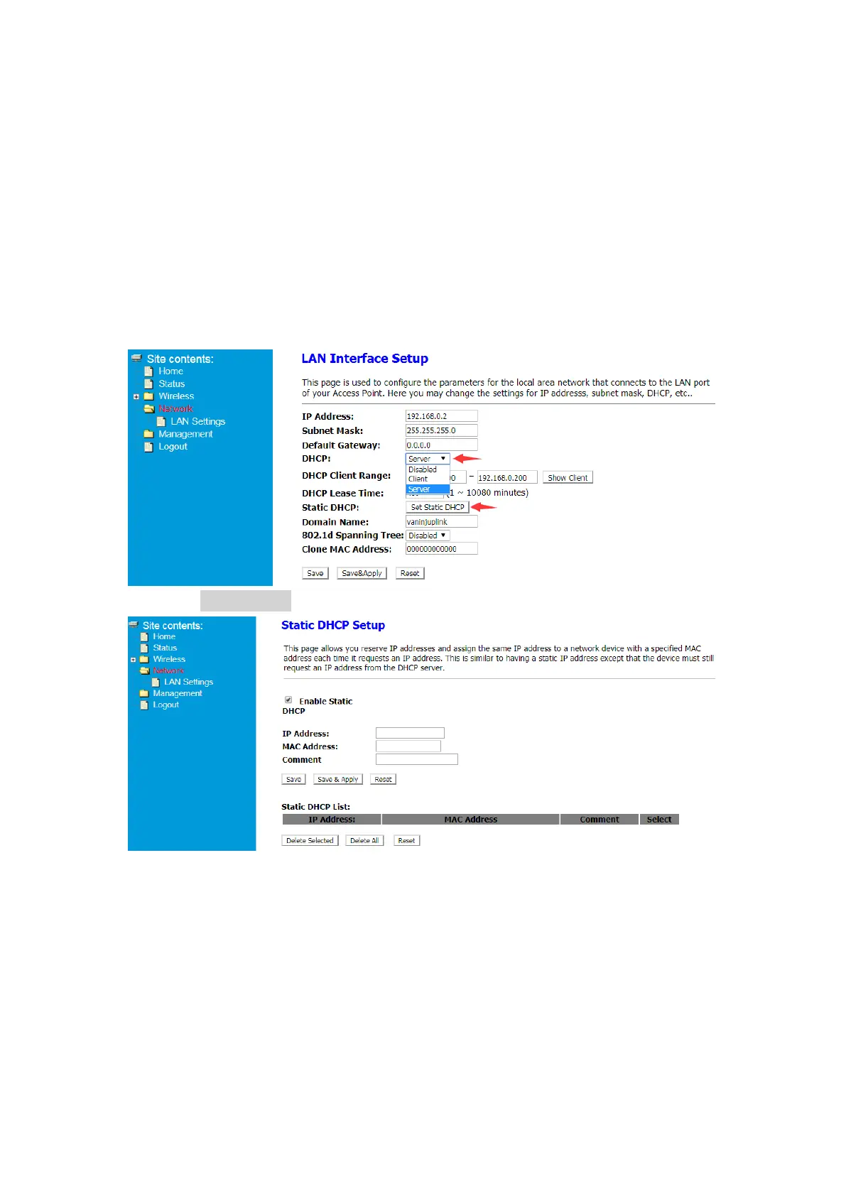 ② Click Network> LAN Settings>Select Sever in DHCP Drop-down menu>Click Set