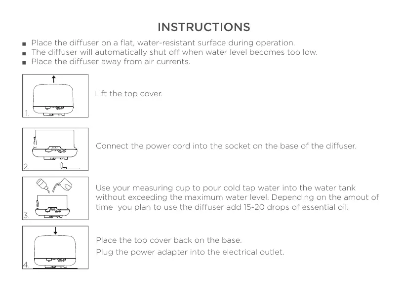 Always place the diffuser on a flat and stable surface. Never on carpet, bed, cushions, or