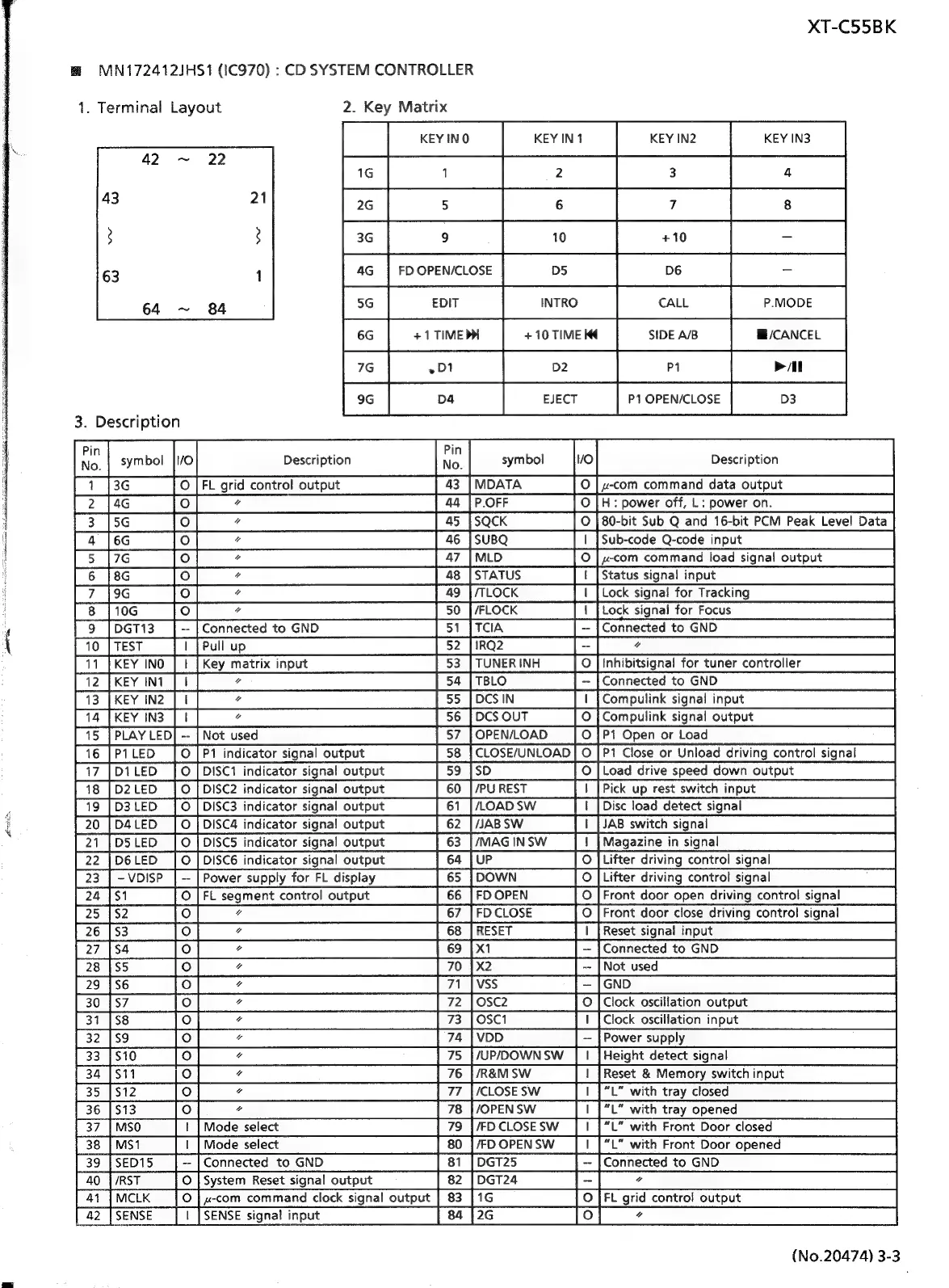 JVC CA-C55BK - IC Descriptions - CD System Controller; IC970 Terminal Layout, Key Matrix, and Description