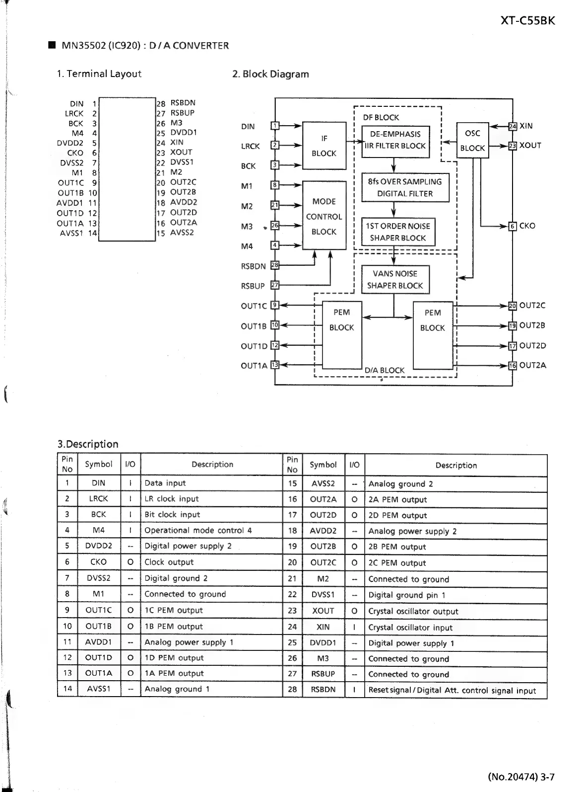 JVC CA-C55BK - IC Descriptions - D;A Converter; MN35502 (IC920) Terminal Layout, Block Diagram, and Description