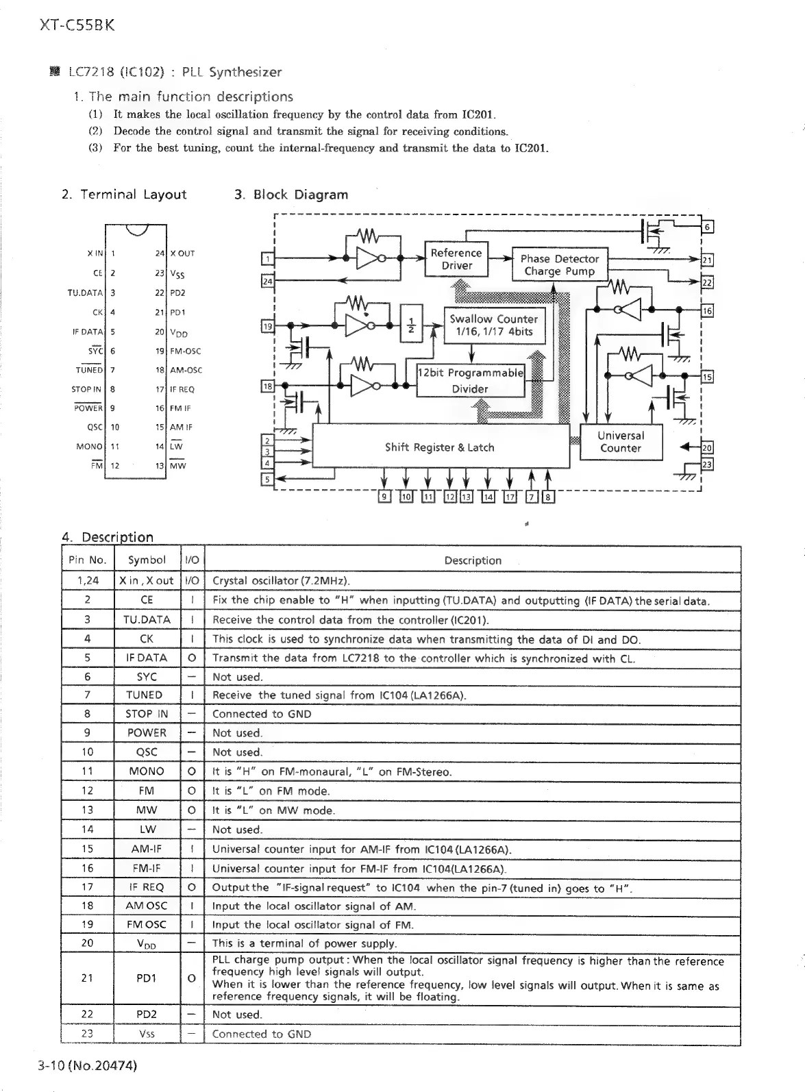 JVC CA-C55BK - IC Descriptions - PLL Synthesizer; LC7218 (IC102) Function, Layout, and Diagram