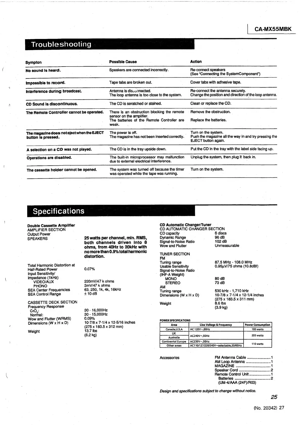JVC ca-mx55mbk - Troubleshooting and Specifications; Common Issues and Solutions; Technical Specifications