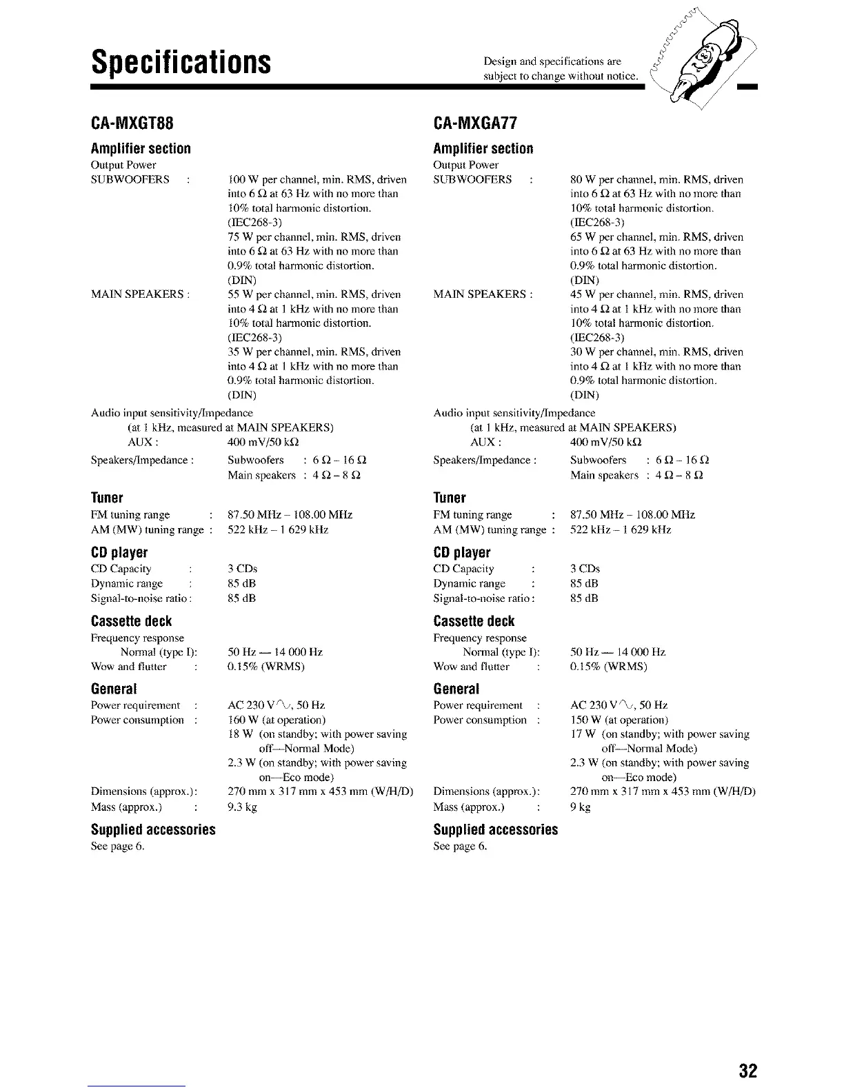 MAIN SPEAKERS : 45 W per channel, min. RMS, driven