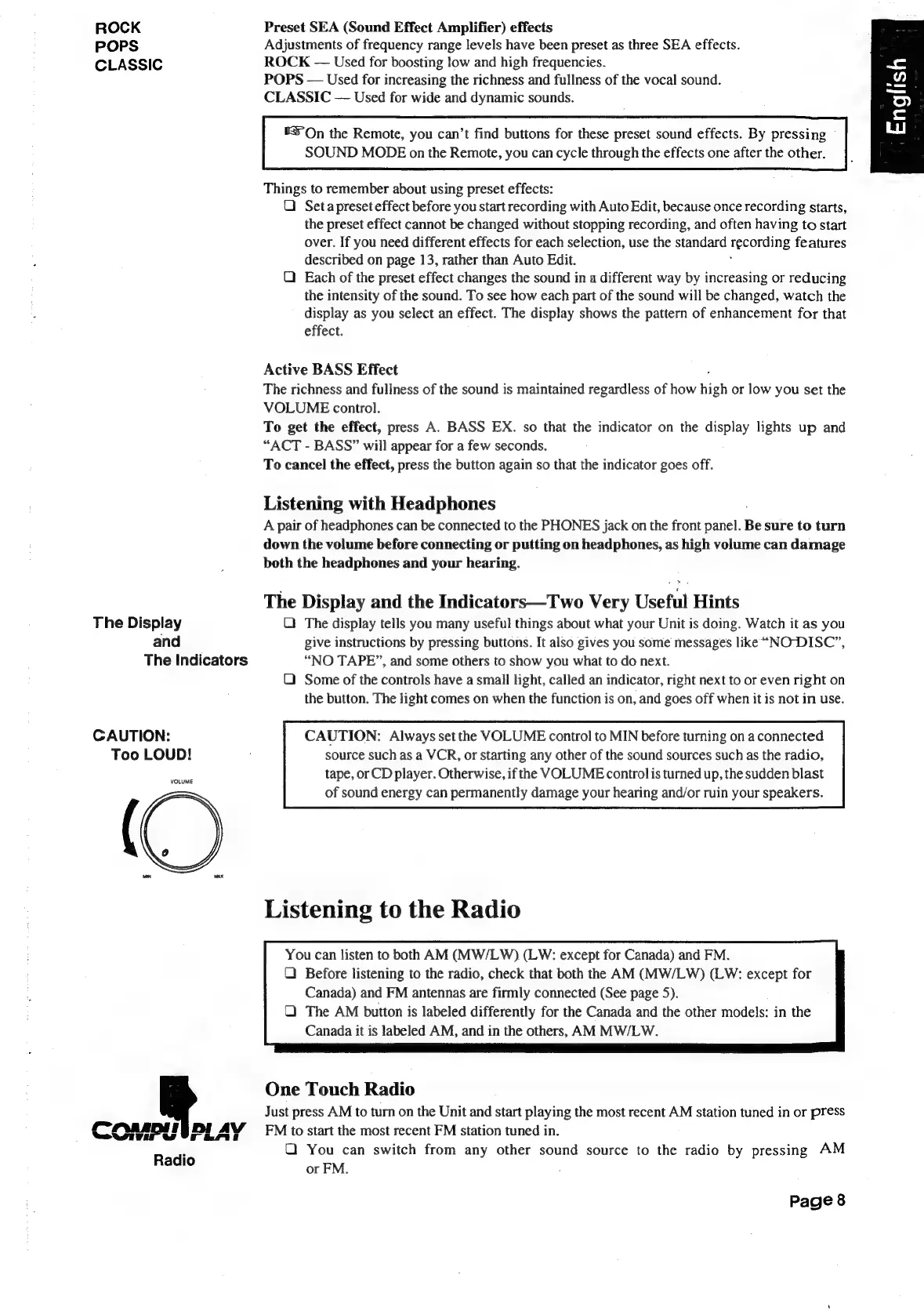 JVC CA-S200 - Preset SEA Effects; Active BASS Effect; Listening with Headphones; Listeming to the Radio