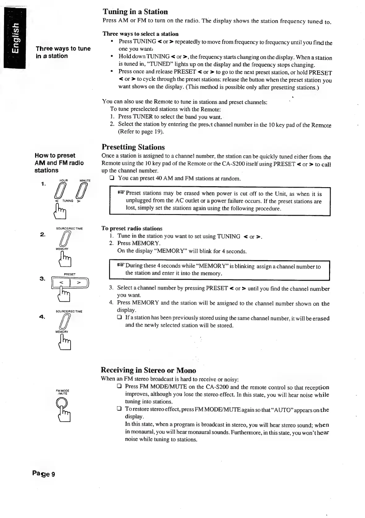 JVC CA-S200 - Tuning in a Station; Eseeeseeeeeee Eiescetalysacbaass; Presetting Stations.0; Receiving in Stereo or MOM0