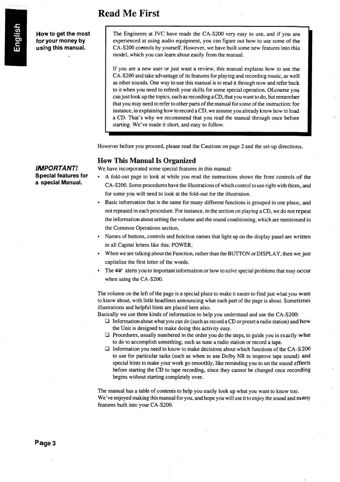 JVC CA-S200 - Read: Me First Wjscicsccsuccsscissnsstecenascusessescteterassoctovossscieconeces; How this Manual Is Organized