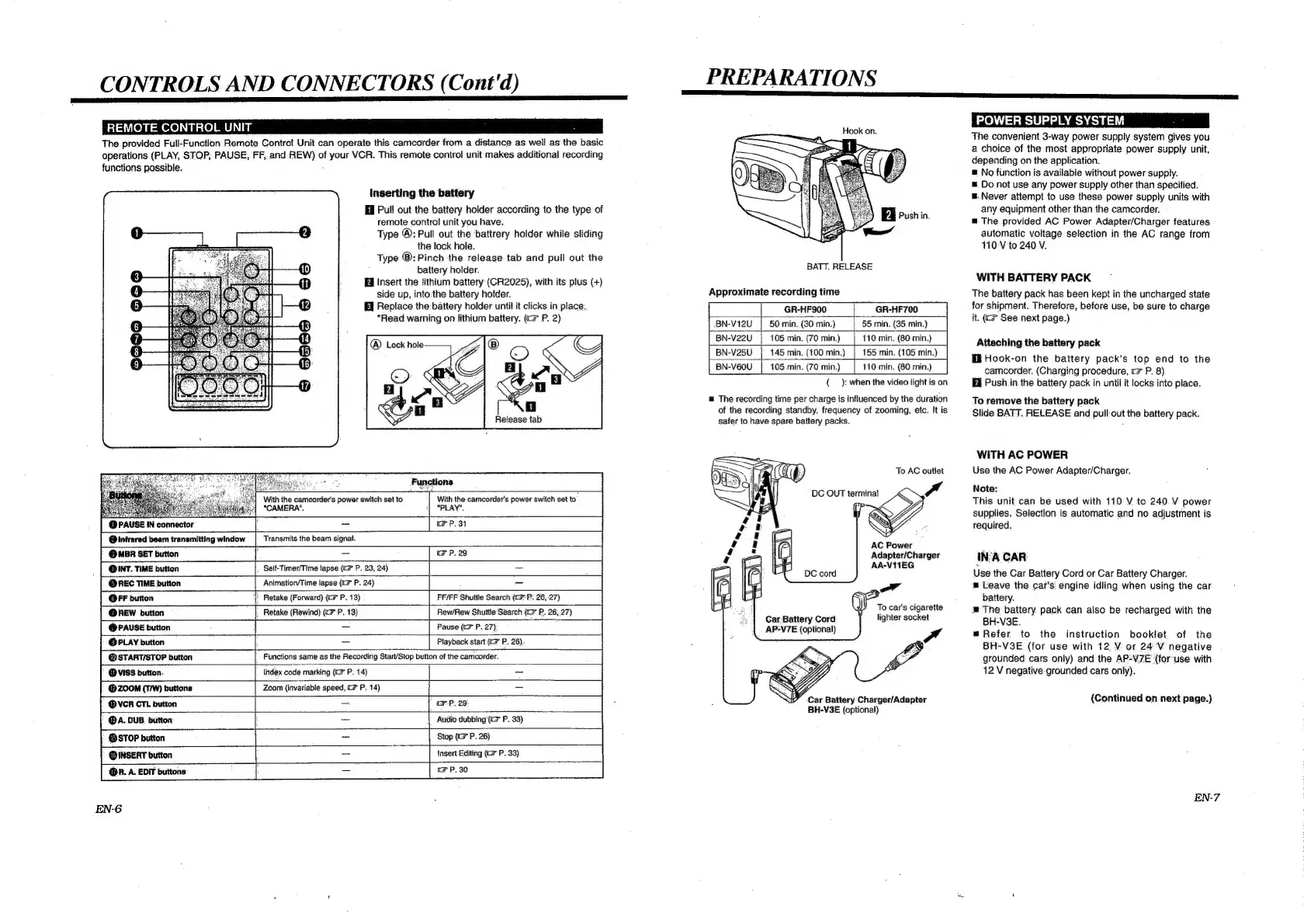 JVC Compact VHS GR-HF700 - Remote Control Unit; Power Supply System
