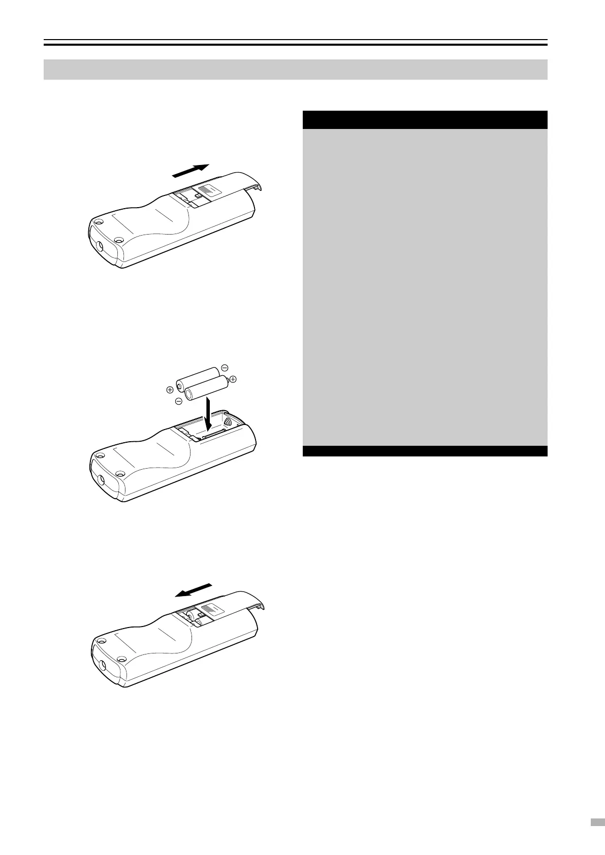 • Remove the batteries if the remote control is not to be used for a