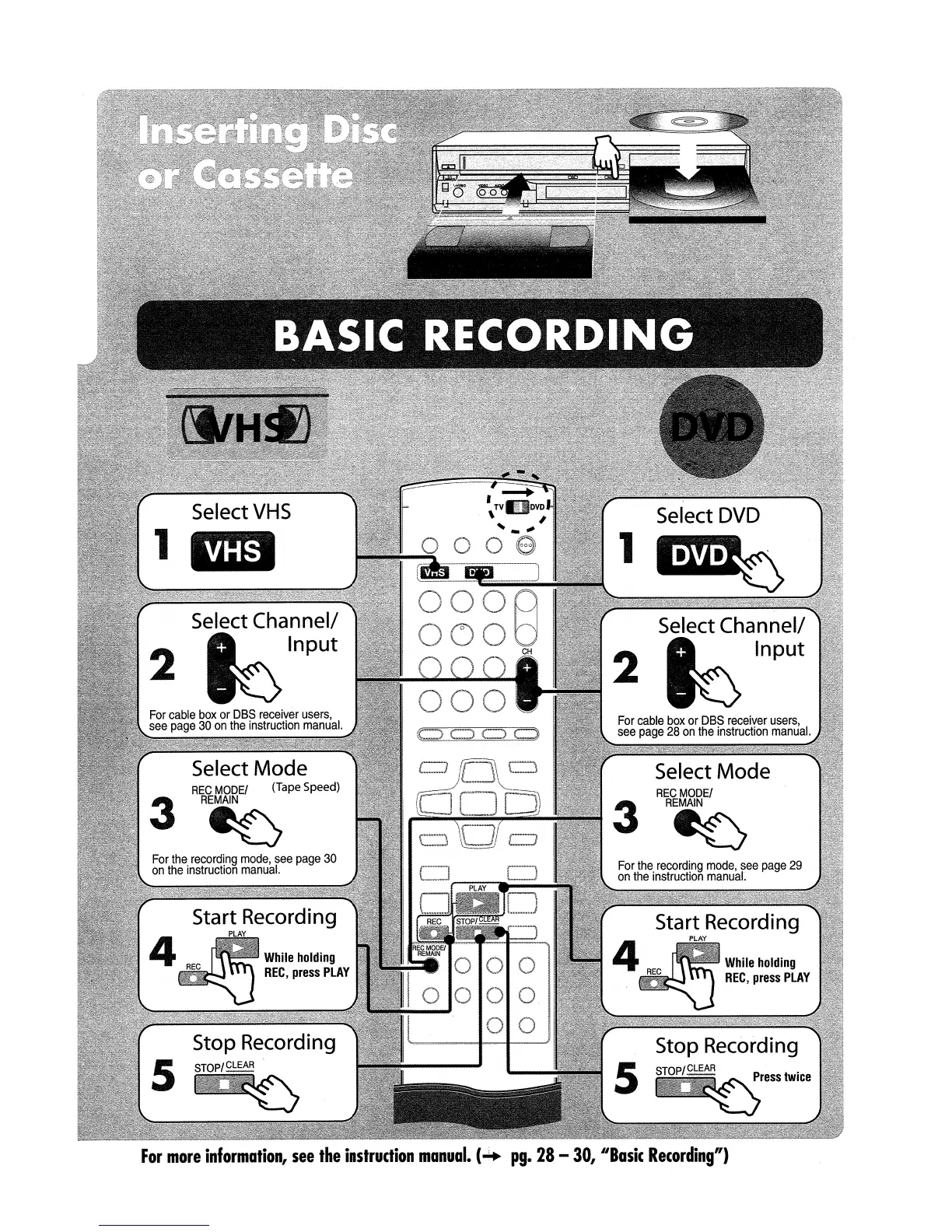 JVC DR-MV5S - Inserting Disc or Cassette; BASIC RECORDING; Select VHS; Select DVD
