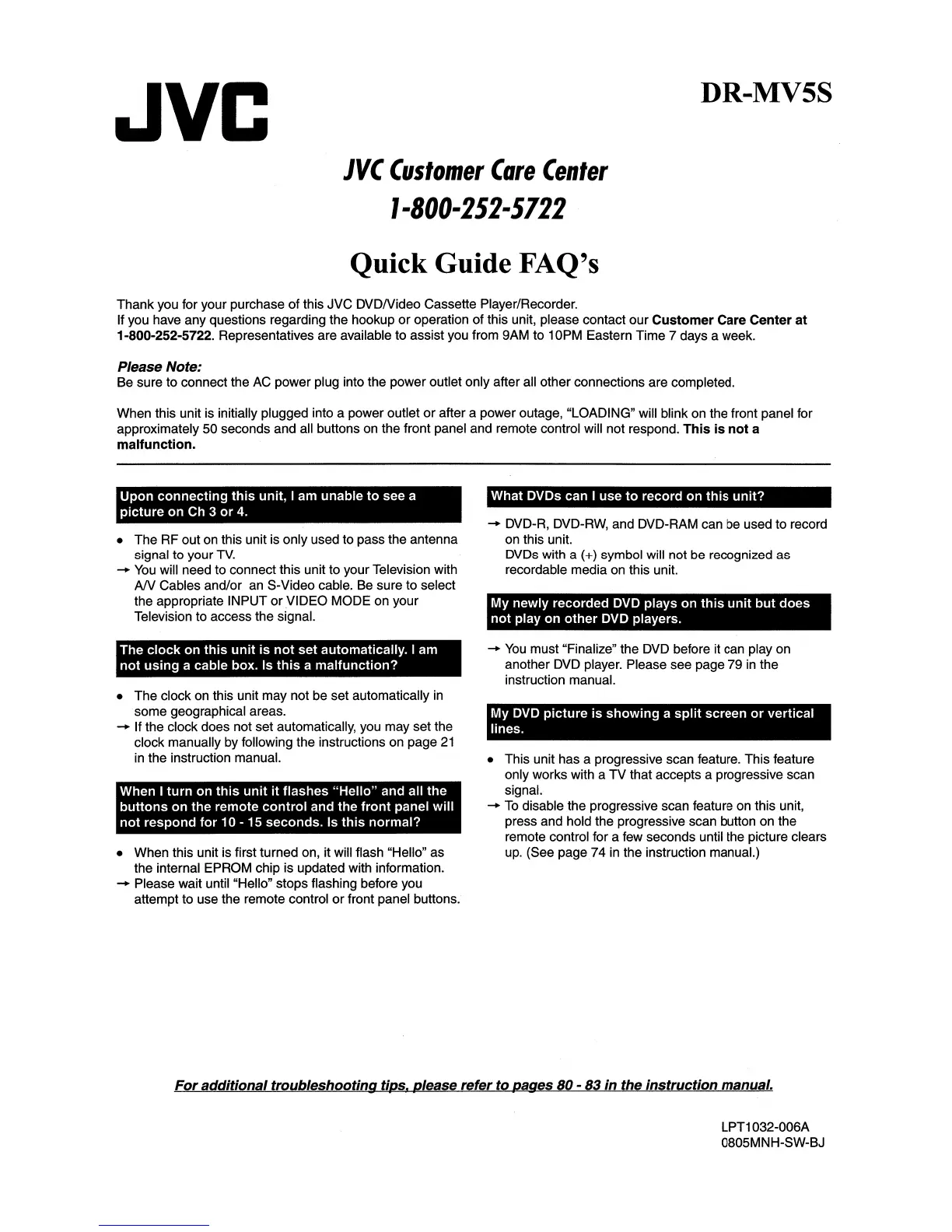 JVC DR-MV5S - Quick Guide FAQs; Connection and Picture Issues; Clock and Remote Control Operation; DVD Recording and Playback