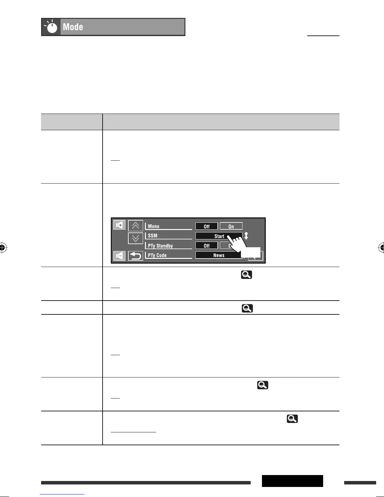 Mono When an FM stereo broadcast is hard to receive, activate monaural mode for better