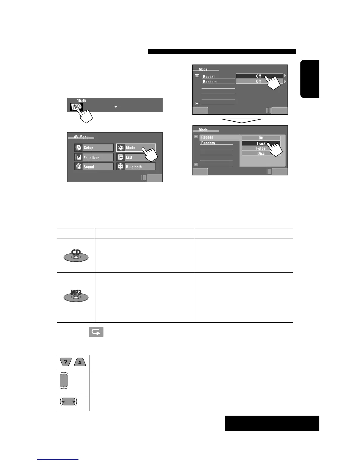 Ex.: To select Track Repeat for an MP3 disc (for CDs, ☞