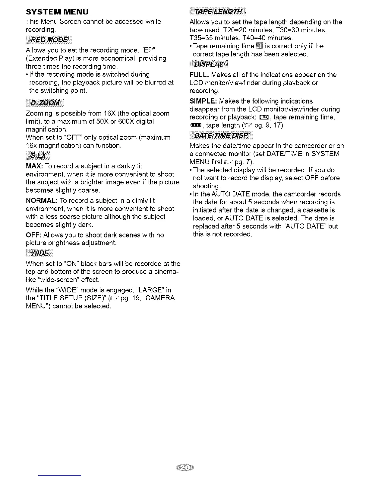 the "TITLE SETUP (SIZE)" (_. pg. 19, "CAMERA