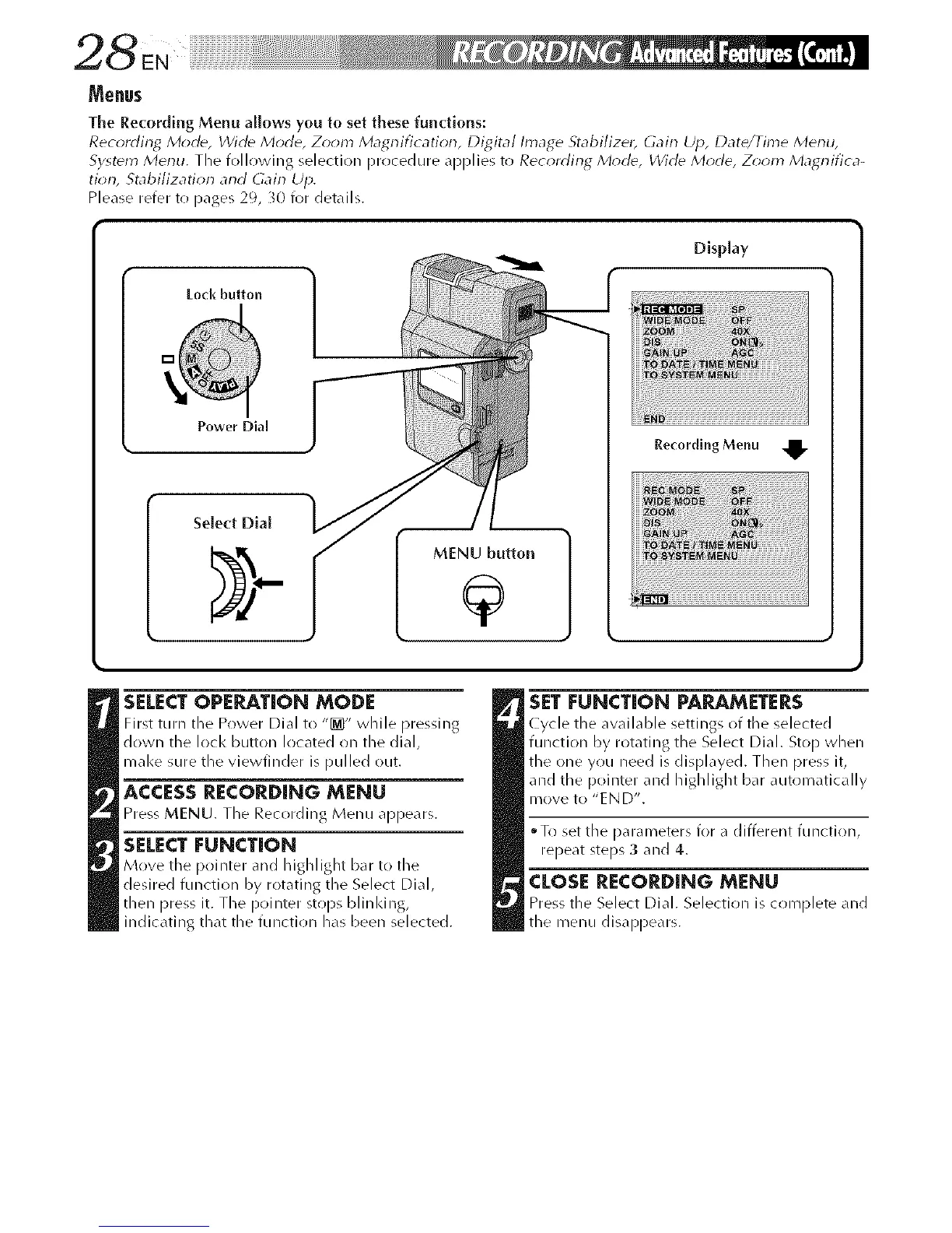 Recording Mode, Wide Mode, Z_m Magrlification, Digital Image Stabilizet, Gain Up, Date/Time Merlll,