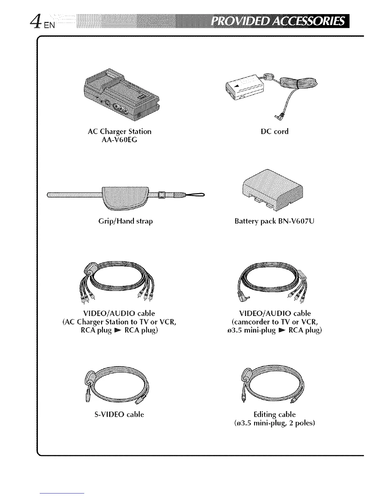 JVC GR-DV3 - Provided Accessories; AC Charger Station and DC Cord; Grip;Hand Strap and Battery Pack; Video and Audio Cables