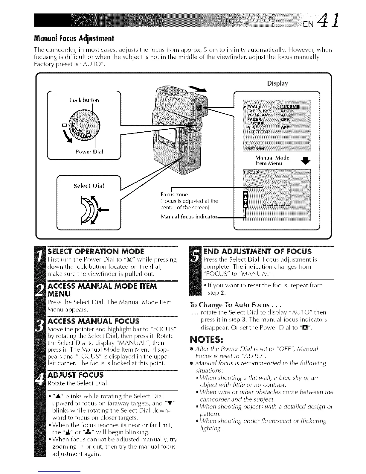 The camcorder, in most cases, adjusts the focus from approx. 5 cm to infinity automatically. However, when