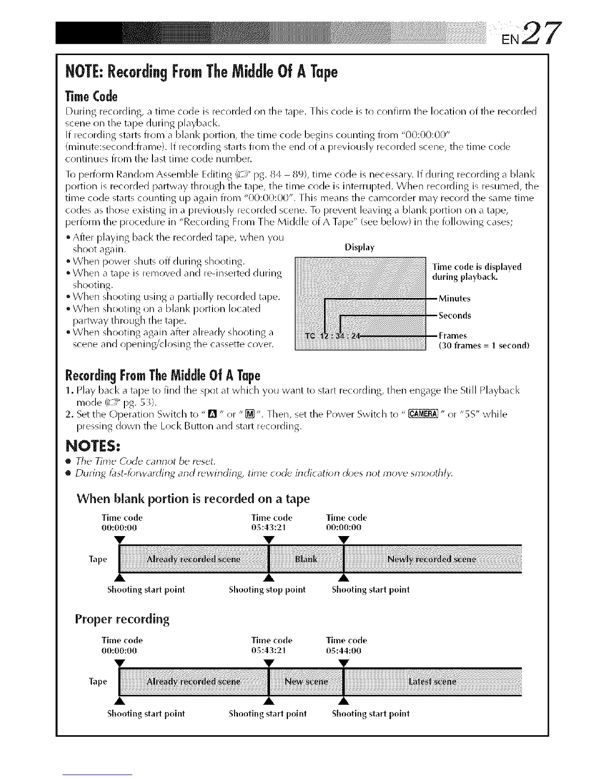portion is recorded partway through the tape, the tirne code is illterrupted. When recording is resumed, the