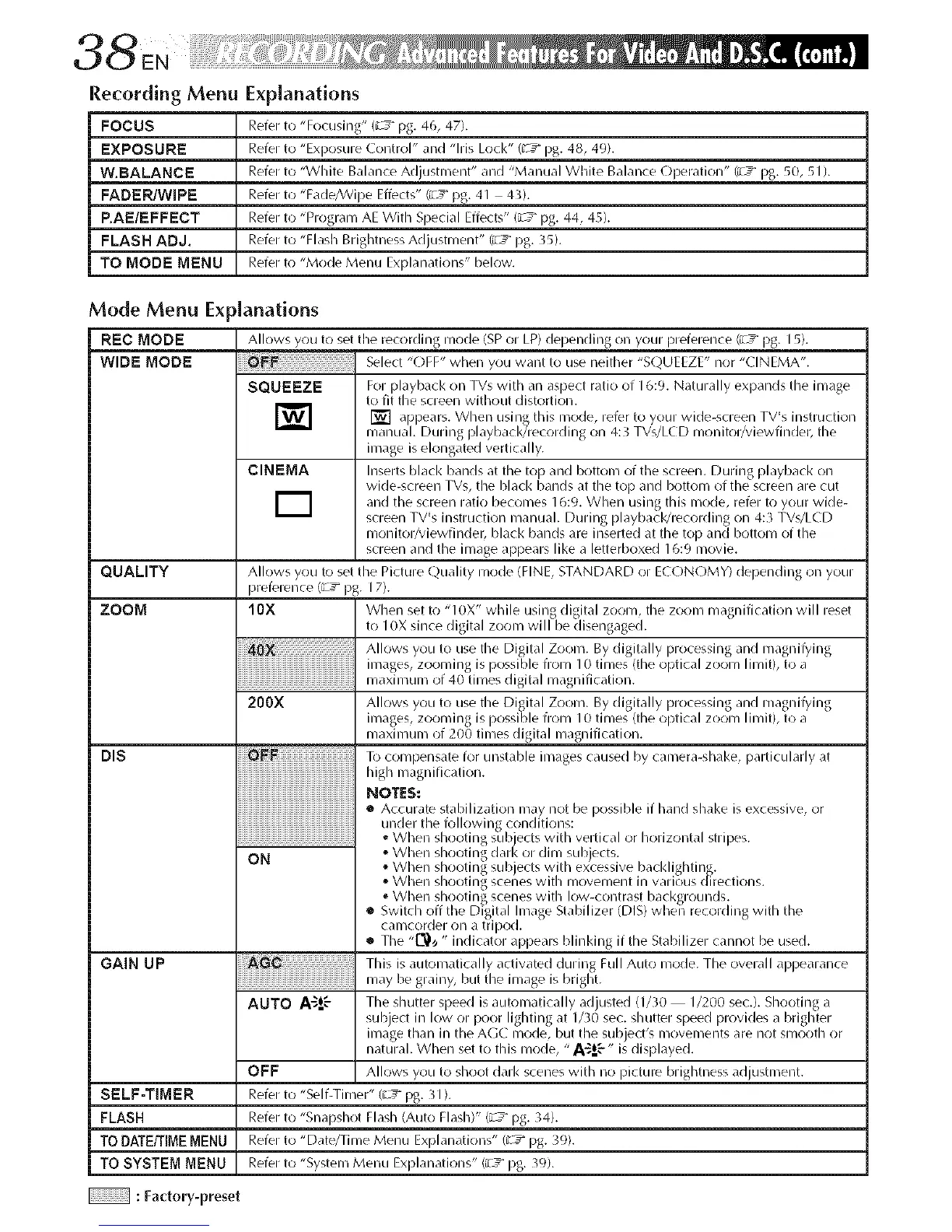 OFF Allows you to shoot dark scenes with no picture brightness adjustment.