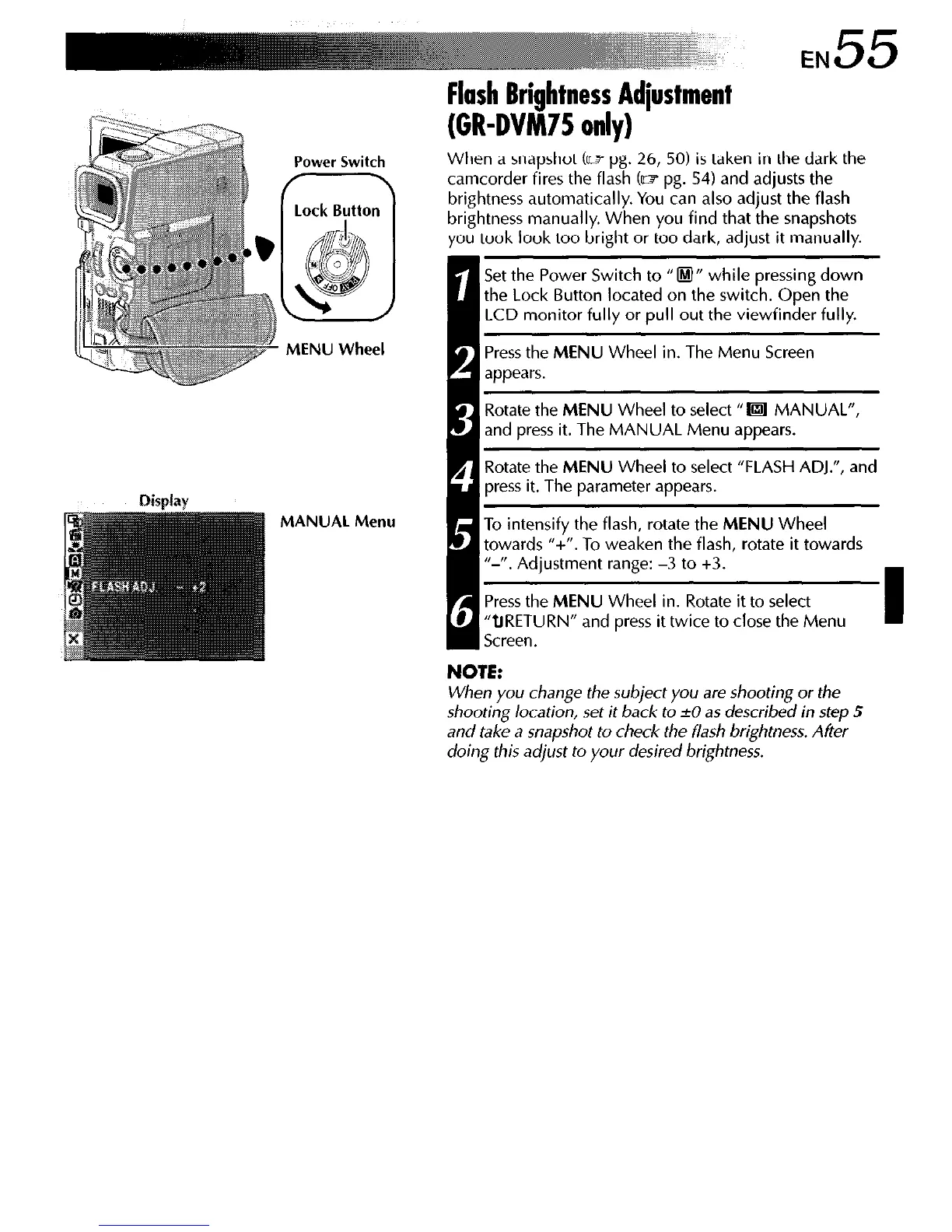 camcorder fires the flash (Q pg. 54 and adjusts the