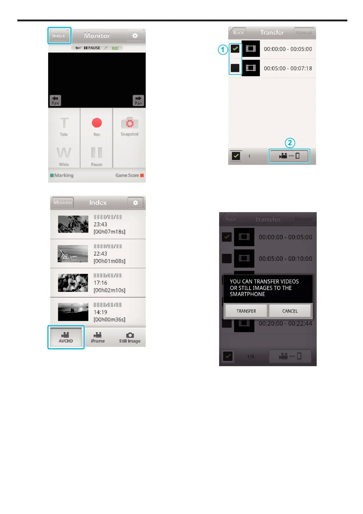 check mark (A) to the files to transfer, and tap the transfer mark icon (B)