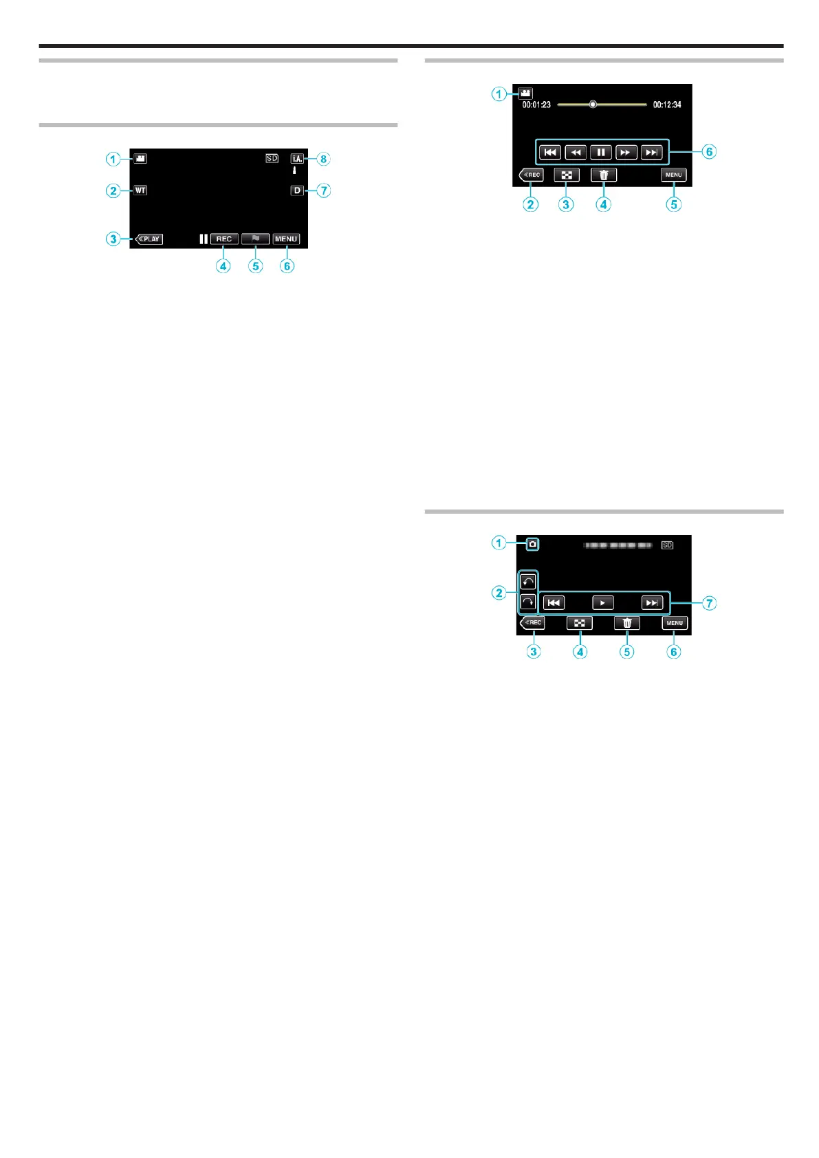 The following screens are displayed during the video and still image modes,