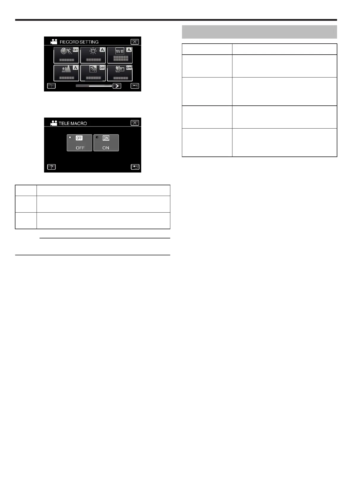 ON Enables close-up shots up to 70 cm at the telephoto (T) end.