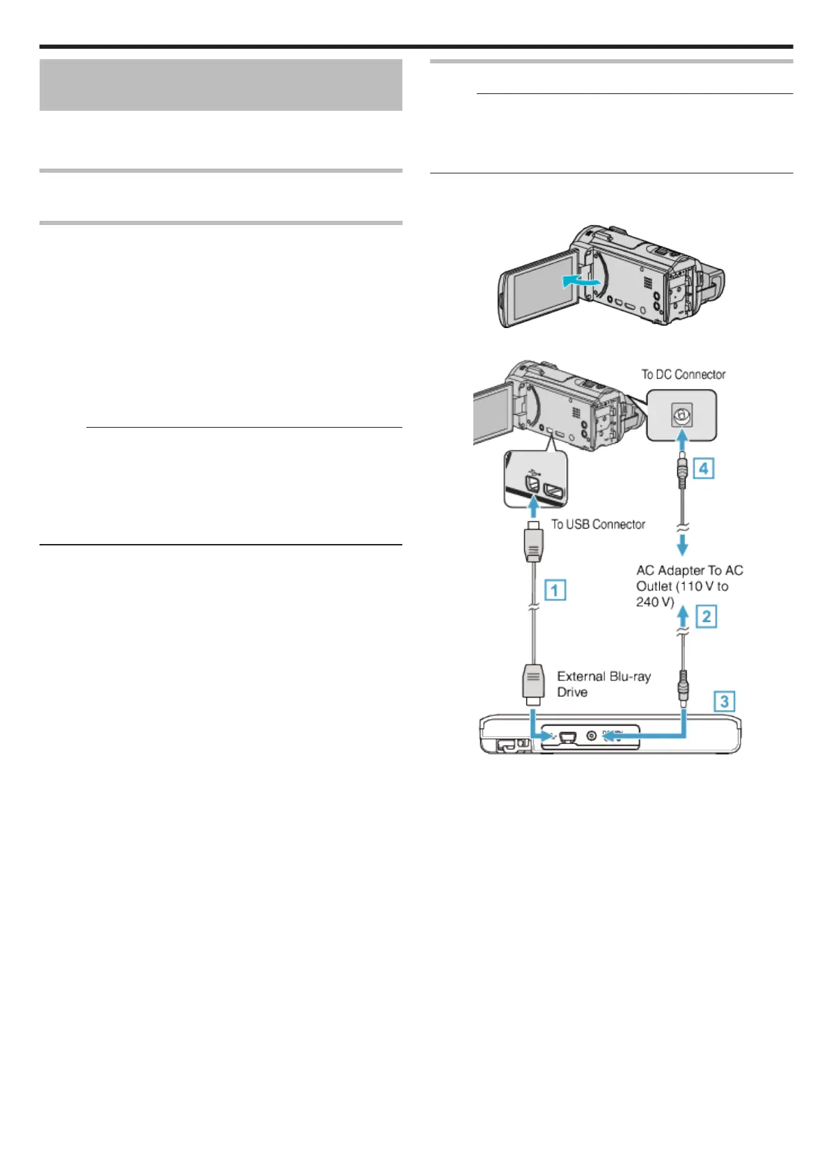 B Connect the AC adapter of the BD writer (external Blu-ray drive).