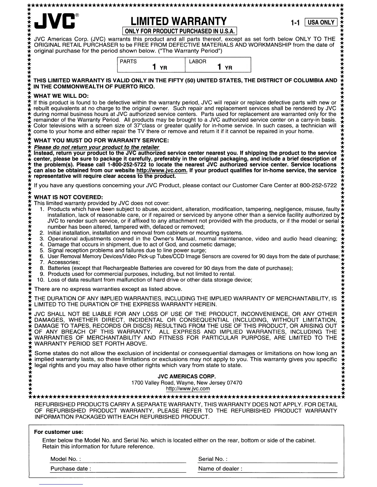 * JVC Americas Corp. (JVC) warrants this product and all parts thereof, except as set forth below ONLY TO THE *